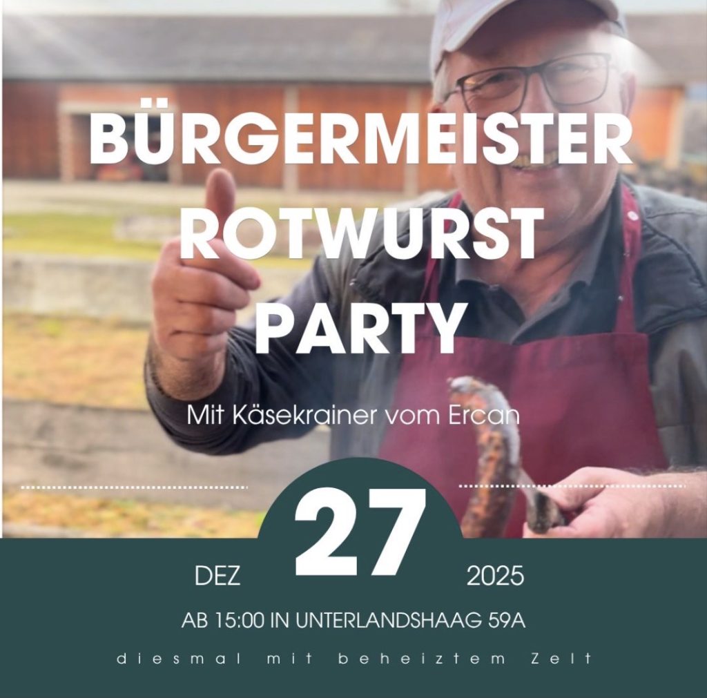 Auch heuer, zu Jahresende, lud unser Bürgermeister David Allerstorfer wieder zu seiner „Rotwurst-Party“ ein, wo sich wieder zahlreiche Besucherinnen und Besucher einfanden. Der Name dieser Party ist auch dem Obmann des Pensionistenverbandes, Pepi Pargfrieder, geschuldet, einem gelernten Fleischhauer. Pepi kredenzte bei der ersten Party rötlich gefärbte Käsekrainer. Danke David für die Einladung, danke Pepi für’s Grillen.